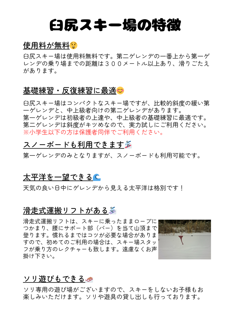 スポーツの振興を図り,もって市民の心身の健全な発達に寄与することを目的に設置され,地域住民のスポーツおよびレクリエーションの場として利用されています。当スキー場は,リフトではなくロープ式滑走運搬装置(ロープ塔)というロープにつかまり,腰にサポート部を当て,山頂まで登る装置を採用しています。