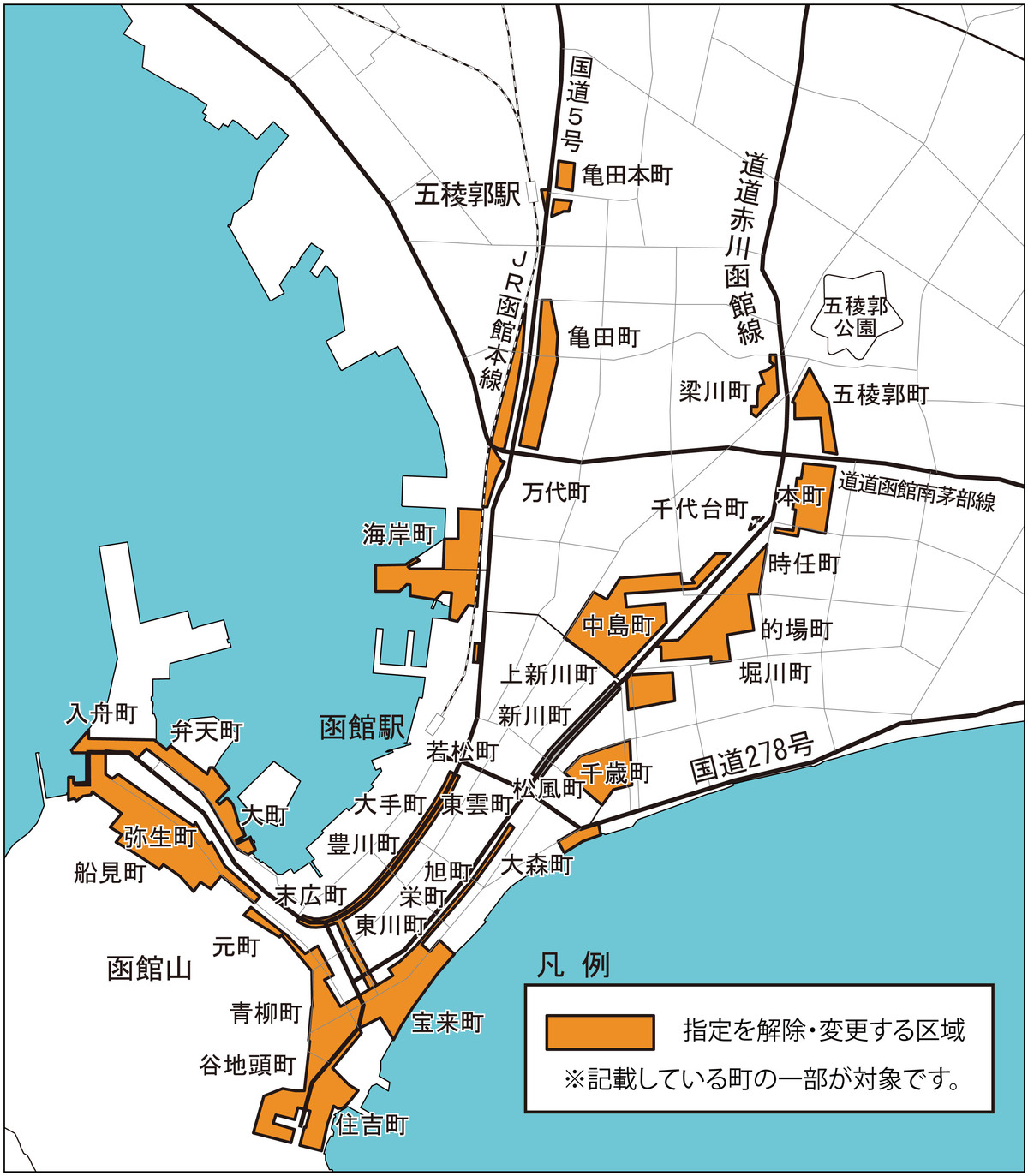 万代町,亀田町,中島町,千代台町,堀川町,的場町,時任町,本町,梁川町,五稜郭町および亀田本町の各一部 - 箇所図