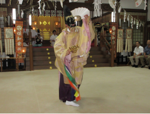 神職による神楽には伝承例の少ない『千歳(せんざい)』『翁』『三番叟(さんばそう)』を伝える点にも特色があります。
