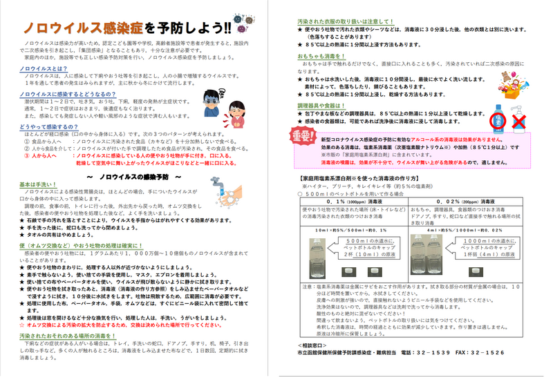 ノロウイルス等による感染性胃腸炎の感染者および疑いのある者が1週間以内に概ね10人以上確認された場合等には,速やかに保健所に報告しましょう。