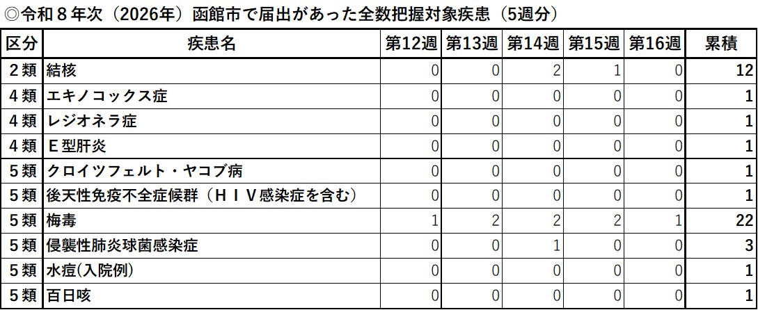 函館市内で発生している全数把握対象疾患について(2026年 第16週時点)