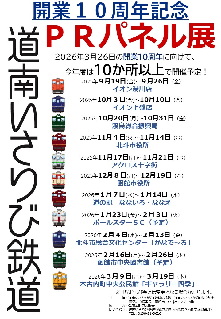 函館市も構成員の一員である「道南いさりび鉄道地域応援隊」では、これを機により多くのみなさまにいさりび鉄道を知り、そしてご利用いただくために、「開業10周年記念 道南いさりび鉄道PRパネル展」を沿線をはじめとする各所で実施します!