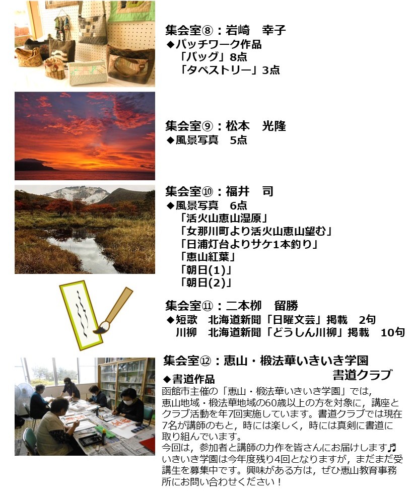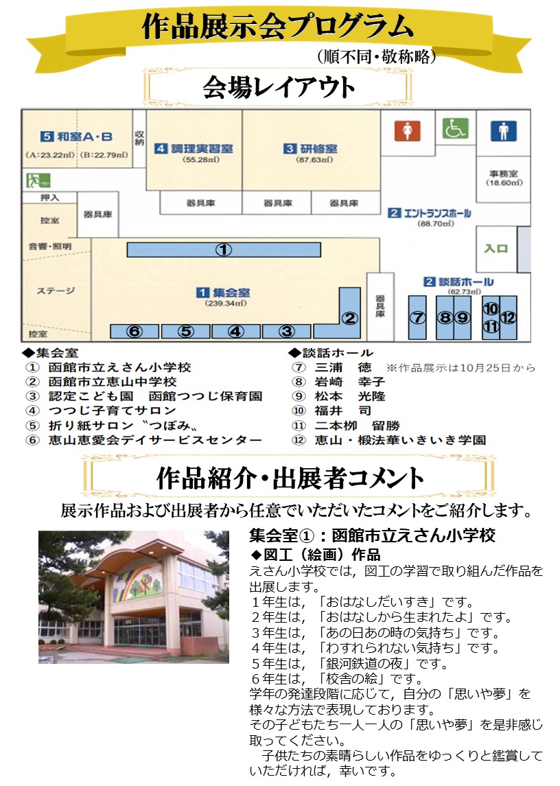 今回は,函館市ボランティア連絡協議会えさんとの共催によりステージイベントを開催するとともに,恵山地域の保育園の園児や小中学校の児童・生徒による絵画,書道や置き物などのほか,地域で文化芸術活動などを行っている方の折り紙,手芸や写真作品を展示しています。
