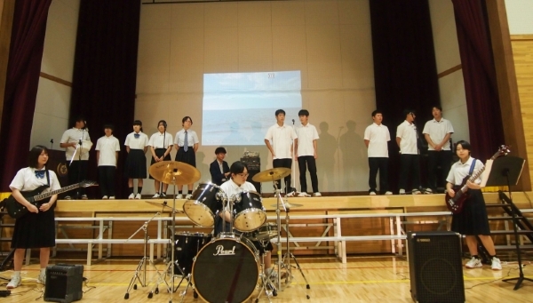 ・南茅部の海と仲間をテーマに,楽器演奏と歌(ハモり)で 発表しました。楽器演奏はバンド形式で各自の担当の楽器を一から練習して曲に仕上げました。