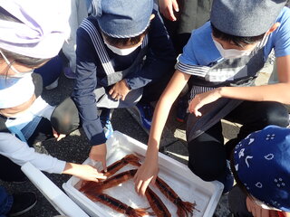 本料理教室では函館市の魚である「イカ」について愛着と知識を深めてもらうため,貴重な活きたスルメイカを用意しました。