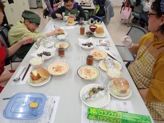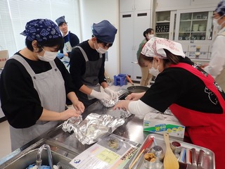 函館市内で多く水揚げされながら,食べる文化があまりない「ブリ」や,函館市の特産品である「函館真昆布」をテーマ食材に据え,9組(19名)の皆様が,講師の指導のもと,ブリフライバーガー,ブリのホイル焼き,函館真昆布チップス,函館真昆布だしのクラムチャウダーにチャレンジし,おいしく調理法を学びました。