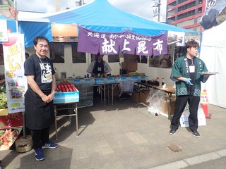 今年で6回目となるイベントでは,市内5つの漁協から提供された長さ8mを超える「函館真昆布」の加工前の実物や最高級品である「献上昆布」,北海道新聞社が作成した「昆布ベルト」などの展示,「函館真昆布」の昆布水などの試飲,昆布に関するアンケートを協力していただいた方にだし用の「函館真昆布」,レシピ集,函館産昆布エキス配合のシャンプー試供品などをプレゼントして「函館真昆布」をPRしました。